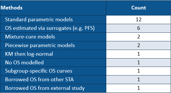 No single modelling strategy dominated. Submissions used everything from standard parametric models to surrogate-based estimation, mixture-cure approaches, piecewise models, or — in one case — no OS modelled at all. The exponential model was most common, while six appraisals leaned on PFS-based surrogate approaches.